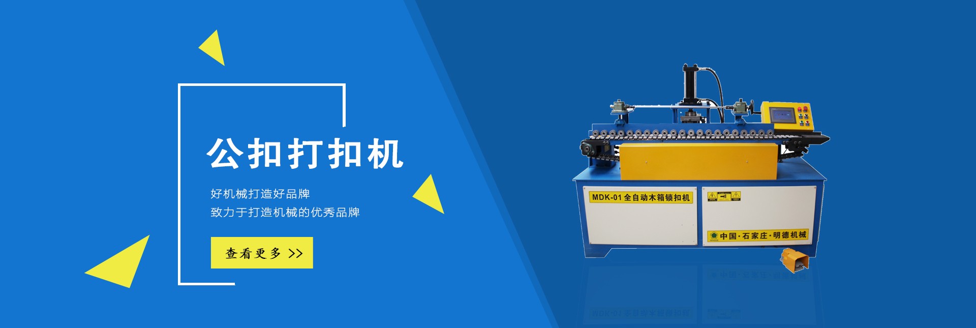 石家莊明德包裝機(jī)械有限公司是國(guó)內(nèi)專(zhuān)業(yè)生產(chǎn)木全自動(dòng)木箱鋼帶機(jī)、半自動(dòng)公母扣木箱打扣機(jī)、全自動(dòng)雙排孔定長(zhǎng)切斷機(jī)、美式托盤(pán)打釘機(jī)械、托盤(pán)刨槽機(jī)、倒角機(jī)、木包裝箱、木托盤(pán)的生產(chǎn)廠家。